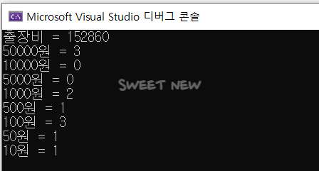 출장비를 입력받은 후, 화폐 매수(오만 원, 만 원, 오천 원, 천 원, 오백 원, 오십 원, 십 원) 계산하여 출력하기 - 2