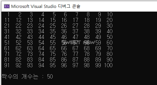 (단, 한 줄에 10개씩 출력하도록 하며, 짝수의 개수도 출력한다.)