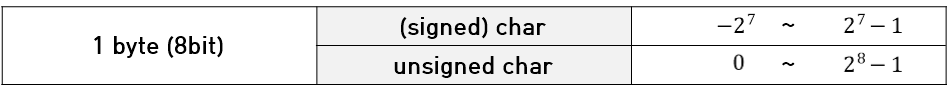 | 문자형 | (signed) char | 1 byte (8 bit) | -128 ~ 127 |