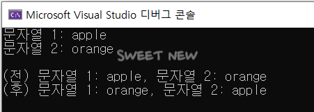 printf("(후) 문자열 1: %s, 문자열 2: %s\n", str1, str2);