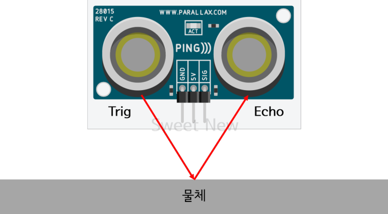 초음파 센서는 초음파를 송신하는 Trig와 수신하는 Echo 두 부분으로 나누어지는데, 송신부에서는 일정한 간격으로 높은 주파수의 초음파를 발생시키고, 수신부는 물체에 부딪혀 반사되어 되돌아오는 초음파를 받는다. 이때 초음파가 발생된 후, 되돌아오는 시간을 측정하여 물체와의 거리를 잴 수 있다.