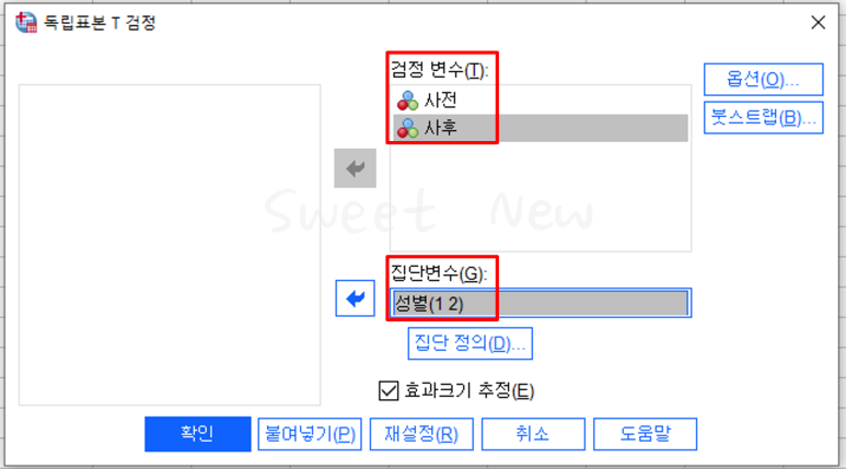 독립변수 T 검정을 선택하면 아래와 같이 왼쪽에는 변수가 나타나고, 오른쪽에는 검정 변수(T), 집단변수(G)를 입력할 수 있다.