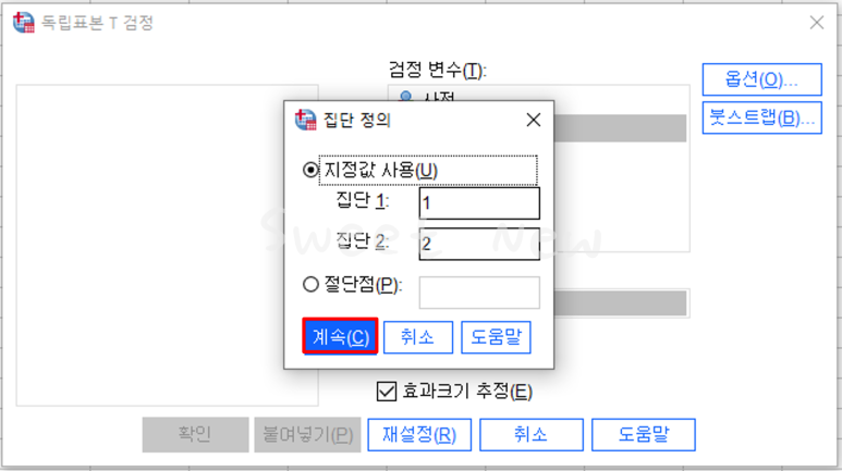 검정 변수에 분석할 변수를 입력한 후, 기준을 정할 집단 변수를 입력해 준다. 이후 '집단 정의(D)'를 선택하여 설정해 준다.
