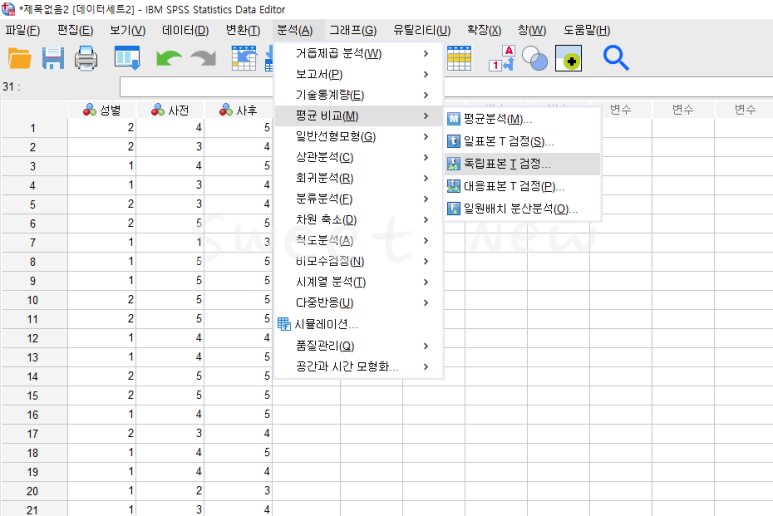 SPSS에서 변수를 입력하고, '분석-평균 비교(M)-독립표본 T 검정'을 선택해 준다.