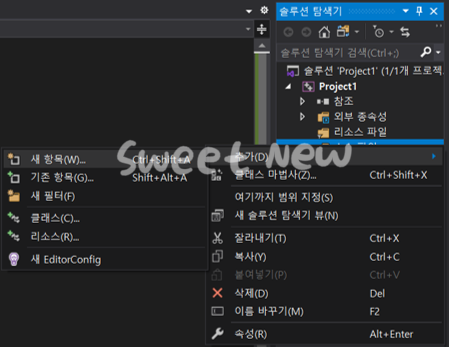비주얼 스튜디오(Visual Studio) 오른쪽의 솔루션에서 "소스 파일"을 선택하고 우 클릭 후, '추가-새 항목(W)'을 선택한다.