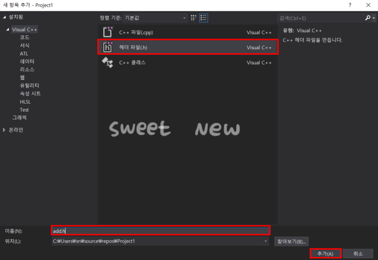 아래와 같이 해당 프로젝트에서 '새 항목 추가' 화면이 나타난다. 헤더 파일(.h)를 추가해야 하기 때문에 '헤더 파일(.h)'를 선택해 준다. 그리고 파일명을 "add.h"로 설정하고 '추가(A)'를 선택한다.