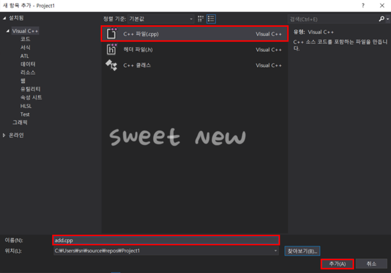 아래와 같이 해당 프로젝트에서 '새 항목 추가' 화면이 나타난다. 소스 코드(.cpp)를 추가해야 하기 때문에 'C++ 파일(.cpp)'를 선택해 준다. 그리고 파일명을 "add.cpp"로 설정하고 '추가(A)'를 선택한다.