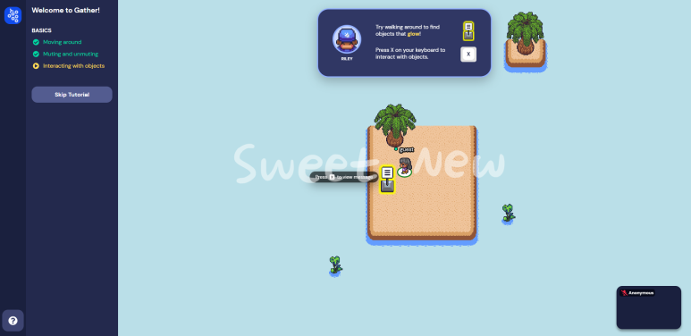 게더타운은 게임처럼 간단한 튜토리얼을 진행해 준다. 키보드의 화살표 또는 W(↑), A(←), S(↓), D(→)를 이용하여 캐릭터를 움직일 수 있다.