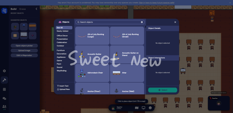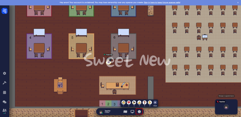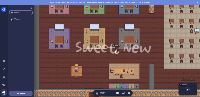 또한 게더타운은 가까이 있는 아바타와만 대화가 활성화된다.(확성기 공지 및 활동 영역 제외) 즉, teacher 캐릭터와 guest 캐릭터의 위치가 멀면 teacher 캐릭터를 기준으로 guest 캐릭터는 비활성화되어 있다.