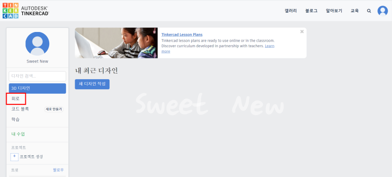 3. 틴커캐드에 로그인하면 디자인을 선택할 수 있으며, '회로(Circuit)'를 선택한다.