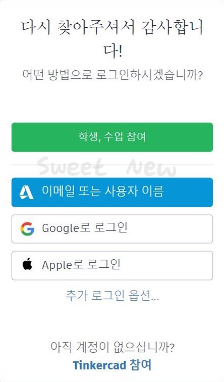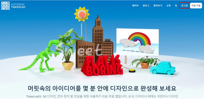 1. 틴커캐드 홈페이지(www.tinkercad.com)에 접속하고, 오른쪽 상단의 '로그인'을 클릭한다.