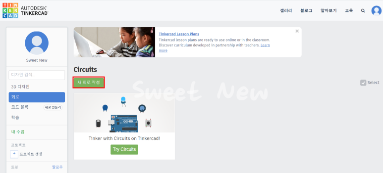 4. '새 회로 작성'을 클릭하여 새로운 프로젝트를 생성한다. (저장한 프로젝트도 확인할 수 있다.)
