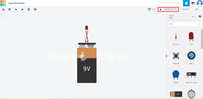 네모 박스 안의 끝부분을 클릭하여 두 개의 부품을 연결해 준다. 연결을 완료한 후, 오른쪽 상단의 "시뮬레이션 시작"을 클릭한다.