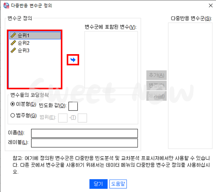 다중 반응 변수군 정의 창이 나타나면 '변수군 정의'에 있는 변수를' 변수군에 포함된 변수'로 옮겨준다.