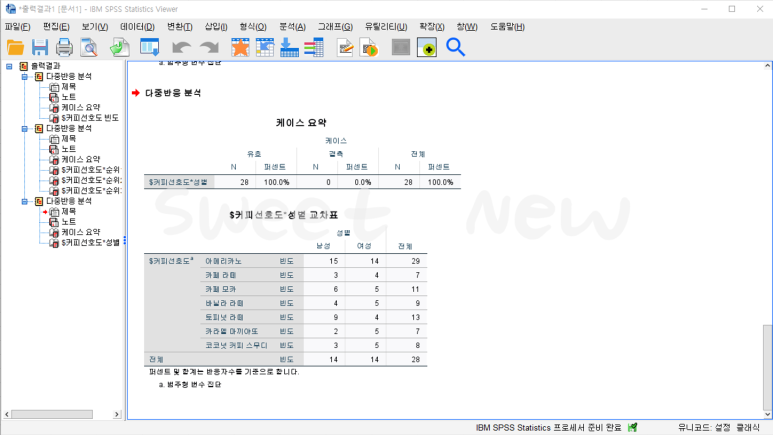 케이스 요약의 유효 N 값으로 설문조사 응답자가 28명인 것을 알 수 있다. 그리고 남·여의 커피 선호도를 확인할 수 있다. 남자 14명, 여자 14명이 응답하였으며, 전체 커피 선호도는 아메리카노인 것을 알 수 있다.