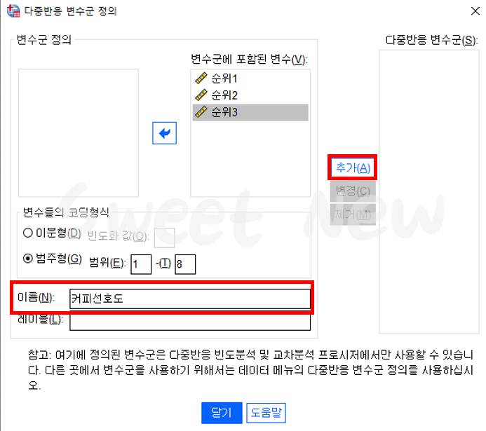 그리고 다중 반응 변수에 대한 이름을 설정하고 오른쪽의 '추가'버튼을 선택해 준다.