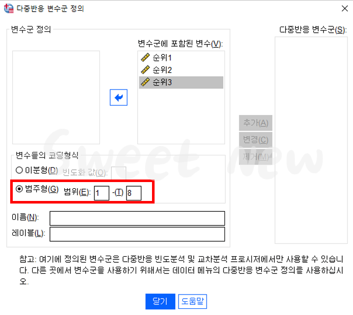 8개 문항에 대한 응답을 분석하기 때문에 "범주형"을 선택하고 범위를 "1-8"로 설정해 준다.