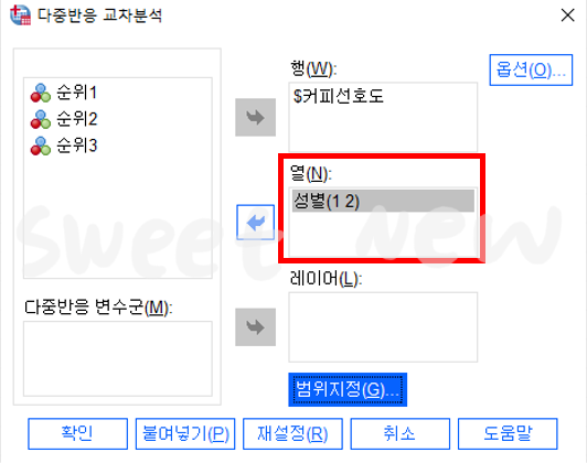 다중 반응 교차분석 창이 나타나면 일반 변수와 다중 반응 변수군의 변수를 행과 열에 나누어 입력해 준다. 그리고 교차분석의 기준이 되는 '성별'을 1(남), 2(여)로 나누어준 후, '확인'을 선택한다.