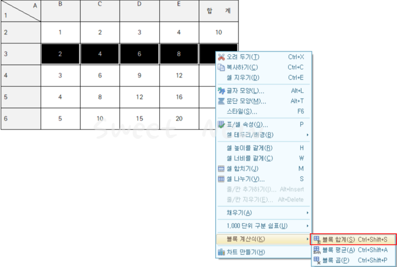 블록 지정 후, 마우스 우 클릭-'블록 계산식(K)'-'블록 합계(S)'를 선택한다.
