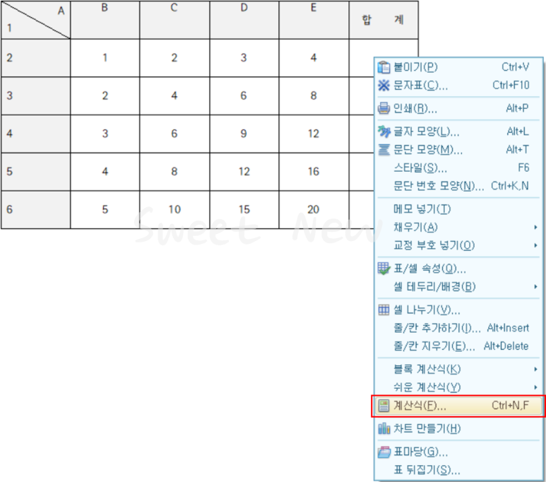 합계를 삽입할 블록에서 마우스 우 클릭-'계산식(F)'를 선택한다.