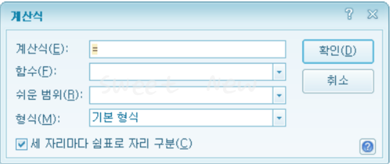 아래와 같이 계산식이 나타나면, 계산식/함수/쉬운 범위/형식 등을 선택할 수 있다.
