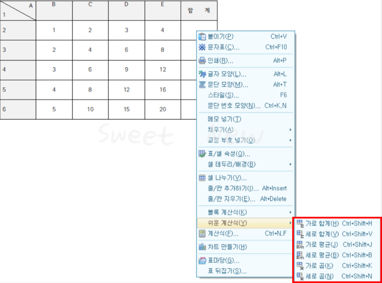 그 외 마우스 우 클릭-'쉬운 계산식(Y)'을 이용해 가로·세로 블록에 대한 합계/평균/곱을 쉽게 구할 수 있다.