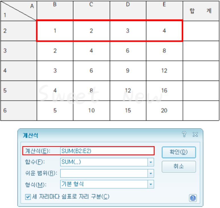 그리고 '계산식(E)'에 생성된 함수에 계산할 블록(B2:E2)을 입력하고 '확인'을 선택한다.