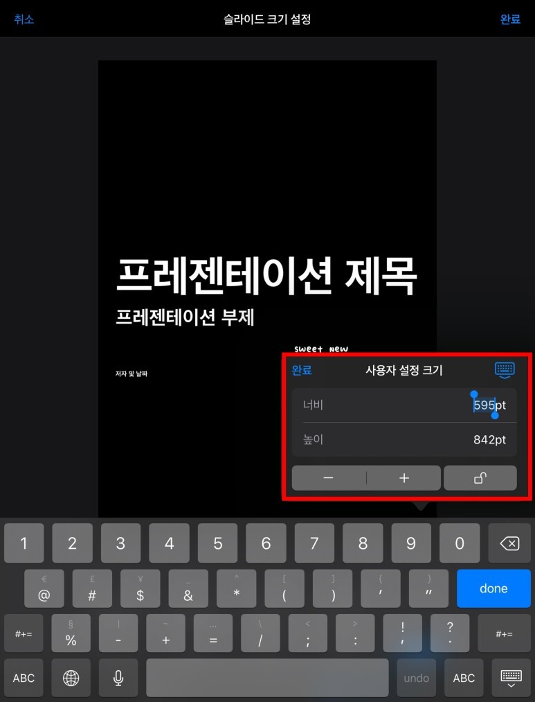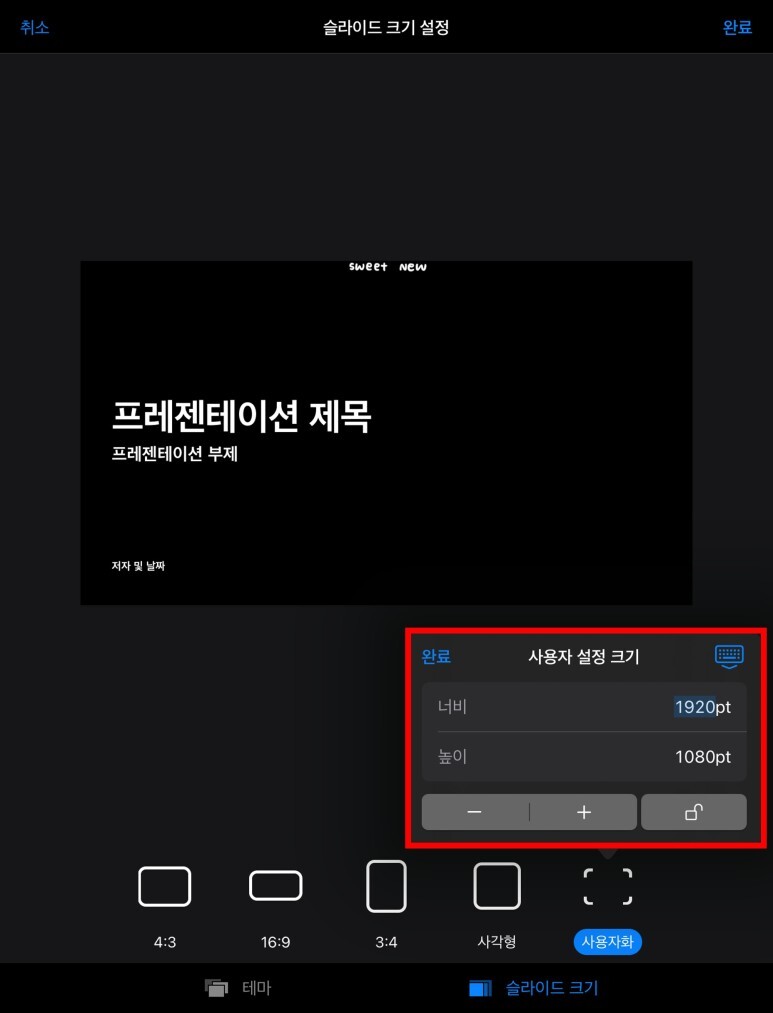 이때 키노트 내 프레젠테이션 크기를 굿노트에 맞게 설정해 주어야 한다.