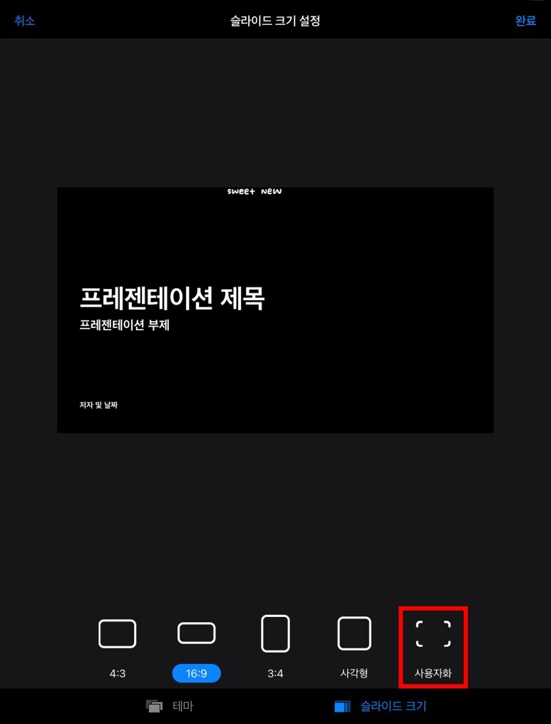 하단의 슬라이드 크기를 선택한다.