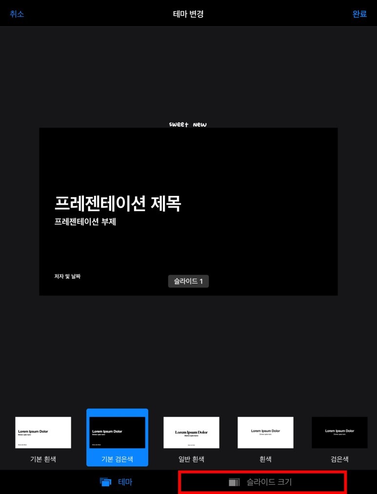 문서 설정에서는 슬라이드 테마와 크기를 설정할 수 있다.