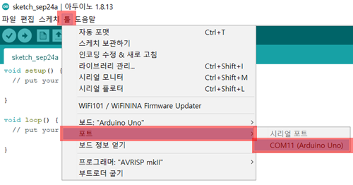 아두이노 보드를 선택한 후에는 포트 번호를 설정해 준다.