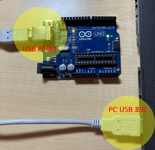 USB 케이블을 아두이노 보드의 'USB 커넥터'에 연결하고, 반대쪽을 PC USB 포트에 연결해 준다.