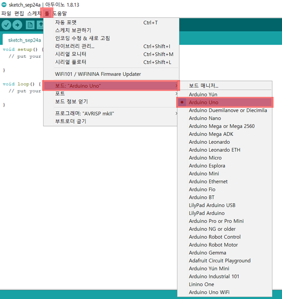 현재의 경우는 아두이노 우노 보드를 사용하기 때문에 "Arduino Uno"를 선택하였다.