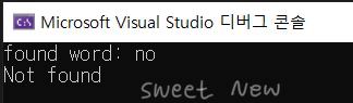 예1. 찾는 문자(열)가 있으면 "Found"를 출력하고, 없으면 "Not found"를 출력한다.