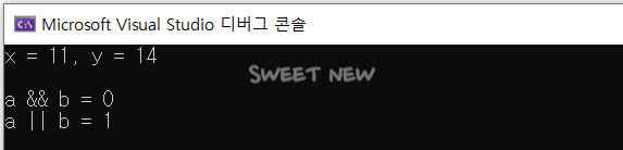 printf("a && b = %d\n", a && b); // AND(논리_곱), a와 b 둘 다 참이면 참